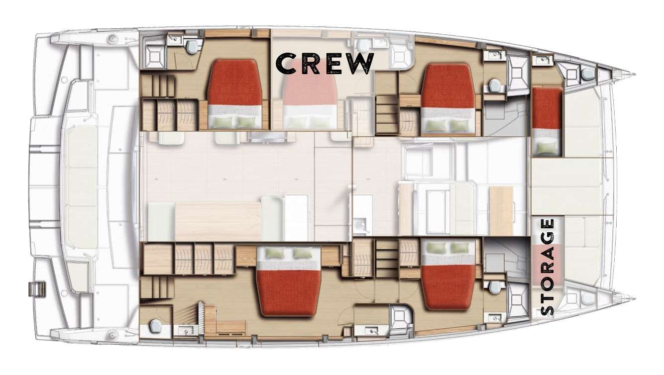 1 king, 3 queen and 1 twin berth guest cabins each with a private en-suite electric head, stall shower and sink/vanity. All cabins with exception of starboard aft cabin are dry heads.
